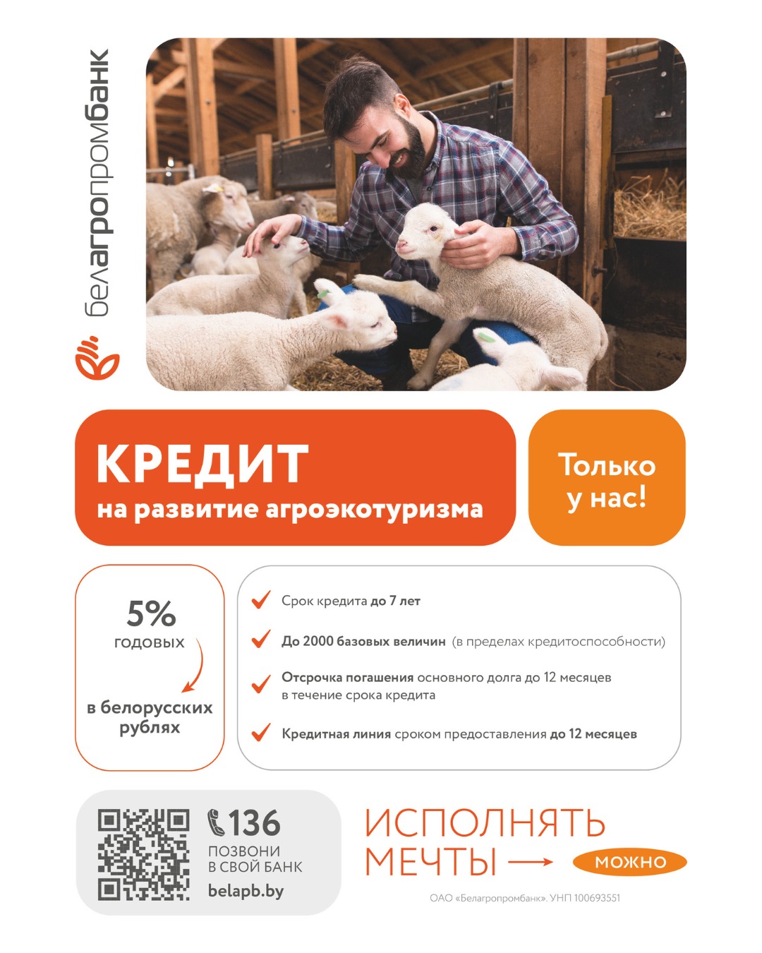 ОАО «Белагропромбанк» предоставляет кредитную поддержку на развитие агроэкотуризма физическим лицам в соответствии с требованиями Указа Президента Республики Беларусь от 02.06.2006 № 372 «О мерах по развитию агроэкотуризма в Республике Беларусь», Указа Президента Республики Беларусь от 04.10.2022 № 351 «О развитии агроэкотуризма».