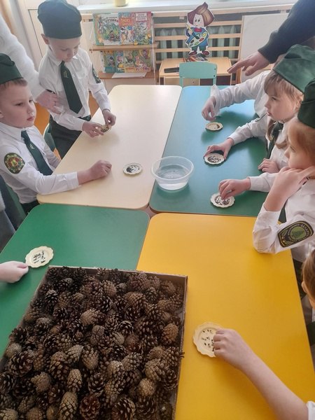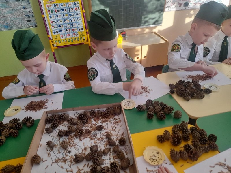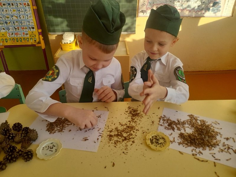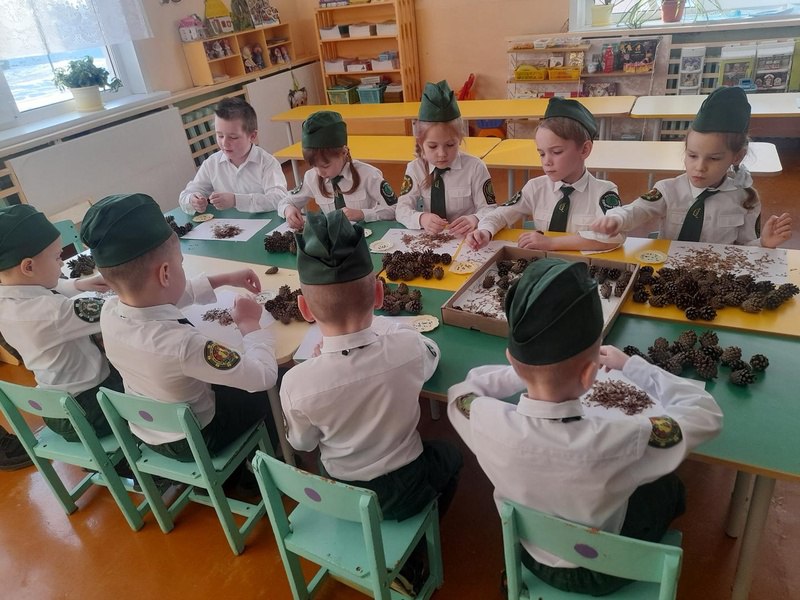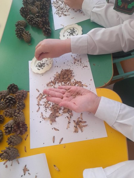 Юные лесоводы, потряхивая высушенные шишки над белым бумажным листом, извлекли семена сосны из раскрывшихся чешуек. Чтобы выбрать жизнеспособные семена, очистили их от крылышек и поместили в воду комнатной температуры. Всплывшие семена удалили, так как они пустые, а осевшие на дно семена достали для дальнейшего проращивания. Поскольку именно тяжёлый, осевший на дно посевной материал является качественным.