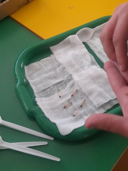 Далее равномерно разложили семена между марлевыми слоями, хорошо увлажнили и поставили в тёплое место для прорастания. Виталий объяснил ребятам, что главное в этом деле – не допускать высыхания марли и регулярно опрыскивать её из пульверизатора до тех пор, пока не проклюнутся корешки.